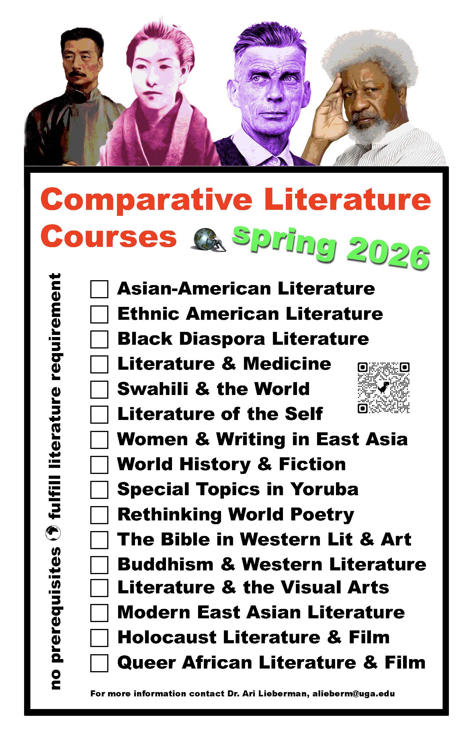 Image: Course Offerings: Asian-American Literature Ethnic American Literature Black Diaspora Literature Literature & Medicine Swahili & the World Literature of the Self Women & Writing in East Asia World History & Fiction Special Topics in Yoruba Rethinking World Poetry The Bible in Western Lit & Art Buddhism & Western Literature Literature & the Visual Arts Modern East Asian Literature Holocaust Literature & Film Queer African Literature & Film